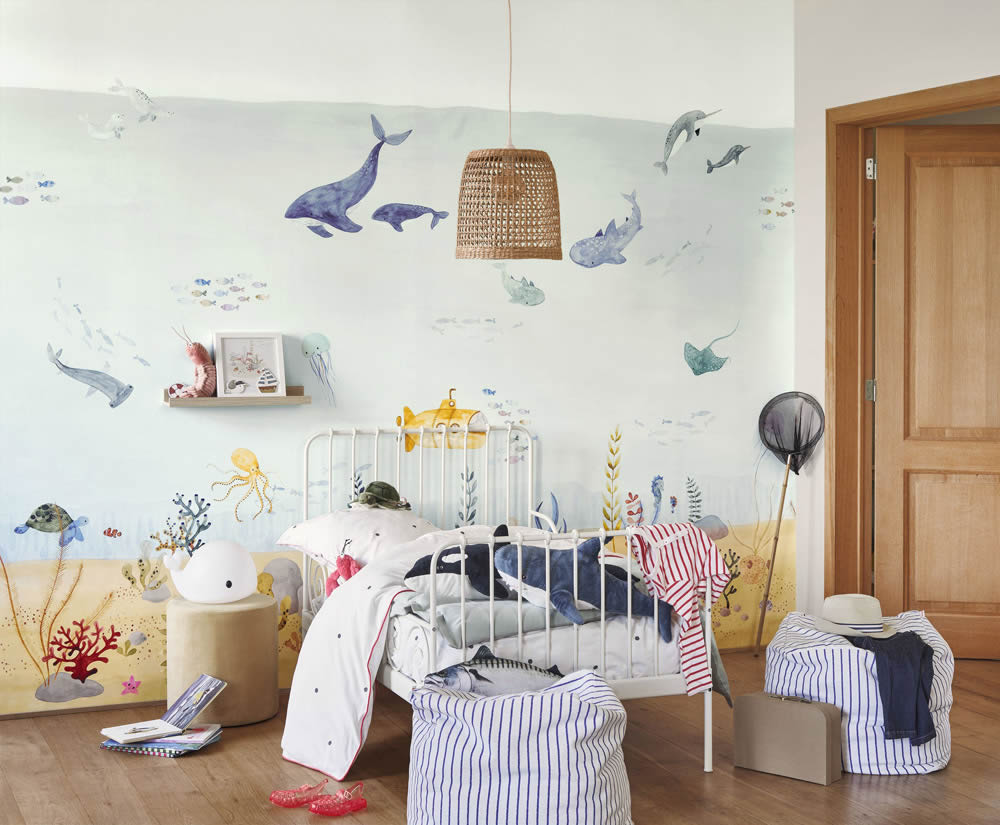 Diese bezaubernde Vliestapete bringt die faszinierende Unterwasserwelt ins Kinderzimmer. Mit detailreich gestalteten Meeresmotiven wie sanft gleitenden Schildkröten, filigranen Korallen und maritimen Pflanzen in dezenten Blautönen auf weißem Hintergrund entsteht eine beruhigende und freundliche Atmosphäre. Die Anordnung der kleinen Meereslandschaften verleiht dem Raum eine spielerische Leichtigkeit, die sich ideal für Babys und Kleinkinder eignet. Das maritime Design ist liebevoll und stilvoll zugleich, wodurch es sich harmonisch in verschiedene Einrichtungsstile einfügt. Die matte, glatte Oberfläche sorgt für eine angenehme Haptik und eine moderne Optik. Mit einem versetzten Ansatz von 21 cm entsteht eine abwechslungsreiche, aber dennoch stimmige Wandgestaltung. Die hochwertige Vliesqualität macht die Anbringung besonders einfach: Mit der Wandklebetechnik wird der Kleister direkt auf die Wand aufgetragen, wodurch die Bahnen mühelos angebracht werden können. Neben der unkomplizierten Verarbeitung überzeugt die Tapete auch mit praktischen Eigenschaften. Sie ist gut lichtbeständig, waschbeständig und kann trocken restlos entfernt werden, was sie besonders pflegeleicht und langlebig macht. Ob als sanfte Hintergrundgestaltung oder als verspielte Akzentwand - diese Tapete bringt eine frische, maritime Note ins Kinderzimmer und schafft eine liebevolle, entspannte Umgebung für kleine Meeresentdecker.