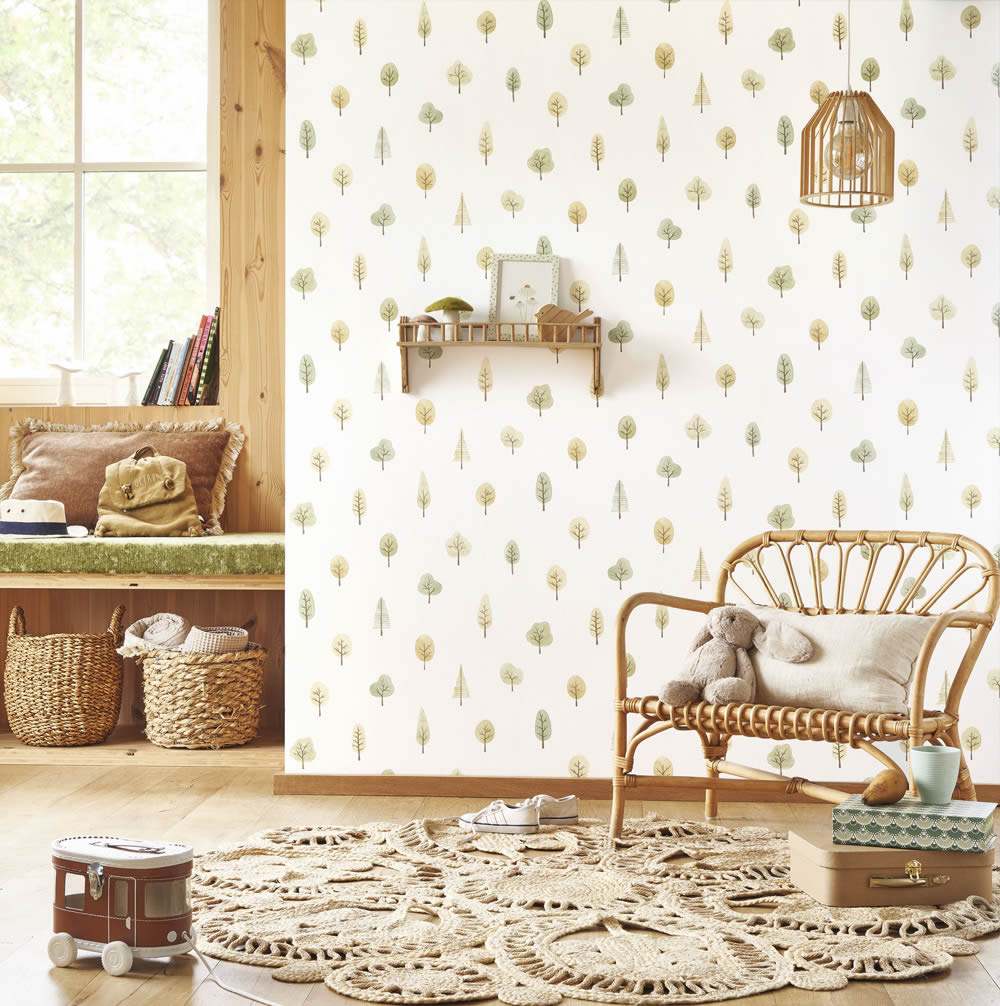 Diese hochwertige Vliestapete mit stilisierten Baum-Silhouetten bringt ein Stück Natur in Ihre vier Wände. Das filigrane Muster zeigt Bäume in verschiedenen Grüntönen auf weißem Hintergrund und sorgt für eine beruhigende, freundliche Atmosphäre. Das Design eignet sich besonders für Baby- und Kinderzimmer, da es eine sanfte und harmonische Umgebung schafft. Die matte, glatte Oberfläche unterstreicht die dezente Farbgestaltung und verleiht dem Raum eine angenehme Optik. Mit einer Breite von 53 cm und einer Länge von 10,05 m bietet die Tapete ausreichend Material für eine großflächige Gestaltung. Der versetzte Ansatz von 21 cm verleiht dem Muster eine natürliche Dynamik, während es gleichzeitig ruhig und ausgeglichen wirkt. Neben dem ansprechenden Design überzeugt die Vliestapete auch durch ihre praktischen Eigenschaften. Sie ist waschbeständig, gut lichtbeständig und kann trocken restlos entfernt werden, was sie besonders pflegeleicht macht. Dank der Wandklebetechnik ist das Tapezieren unkompliziert, da der Kleister direkt auf die Wand aufgetragen wird. Diese Waldtapete ist eine ideale Wahl für alle, die eine natürliche und beruhigende Atmosphäre in ihren Wohnraum bringen möchten.