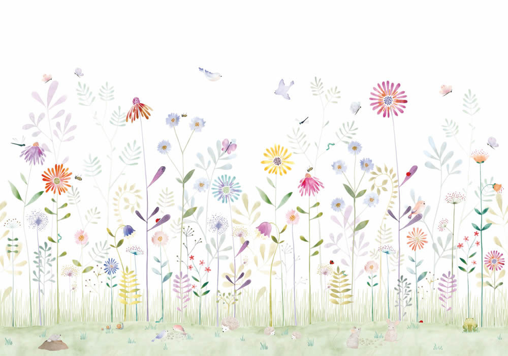 Produktinformationen "Wandbild 4,00 x 2,80 m pastellfarbene Blumenwiese Schmetterlinge"