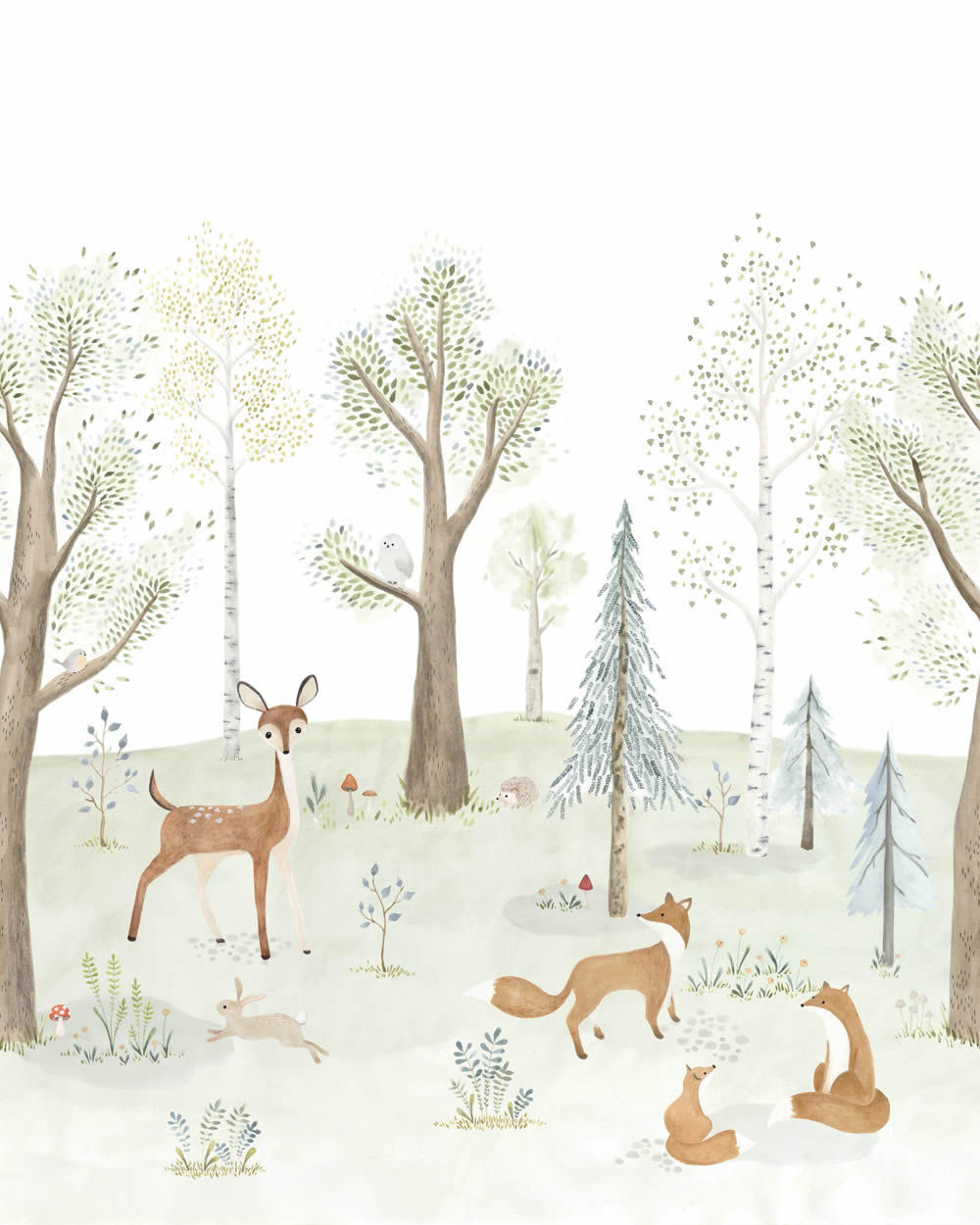 Produktinformationen "Wandbild 2,00 x 2,50 m Waldtiere Bäume Reh Füchse pastellfarben"