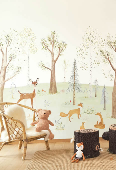 Produktinformationen "Wandbild 3,10 x 2,00 m Wald Bäume Reh Füchse pastellfarben"