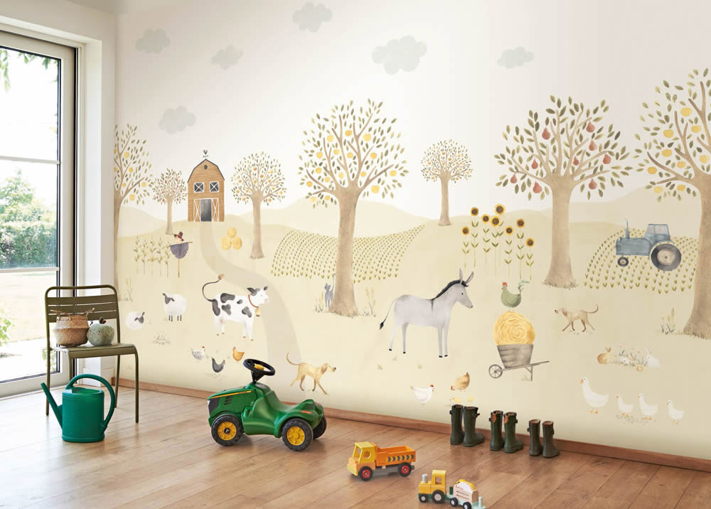 Tiere Wandbilder OUAT88567710 für eine pastellfarbene Raumgestaltung im Kinderzimmer. Ein Wandbild wirkt als toller Hingucker im Kinderzimmer und zur Ergänzung bietet Texdecor viele zum Motiv passende Tapeten. Bauernhof-Motive sind am Tag der perfekte, natürliche Spielebegleiter für Jungs und Mädchen und sorgen in der Nacht für schöne Träume. Die Struktur dieses Wandbildes ist glatt und die Oberfläche ist matt. Die Größe beträgt 4,00 x 2,50 m. Der Tapetenhersteller Texdecor bietet mit seiner Kollektion Casadeco - Once upon a time viele zur Farbe pastellfarben und themenmäßig perfekt auf einander abgestimmte Ergänzungsprodukte. Bäume und Tiere in pastellfarben als perfekter Spielebegleiter für Kids. Themen-Kinderzimmer für Kids. Wandbilder von Texdecor aus dem Trägermaterial Vlies sind besonders leicht zu verarbeiten, strapazierfähig und dank Wandklebetechnik kann der Kleister direkt auf die Wand aufgebracht werden. Tiere Wandbilder wirken als toller Hingucker im Kinderzimmer und zur Ergänzung bietet dieser Hersteller viele zum Motiv passende Tapeten für Kids.