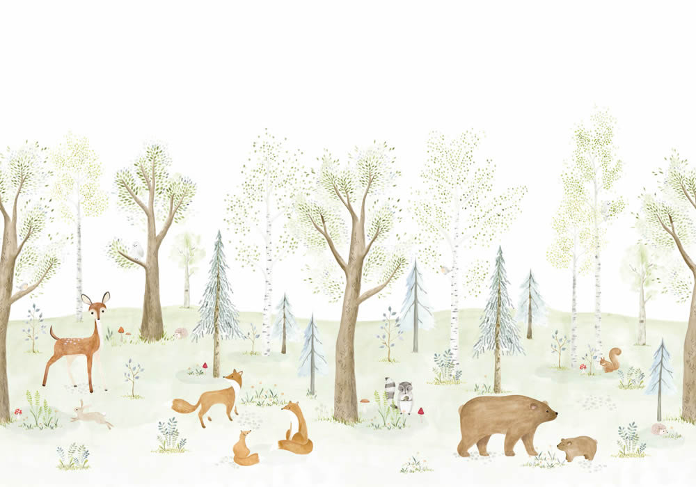Produktinformationen "Wandbild 4,00 x 2,80 m Wald Reh Füchse Bärenfamilie pastellfarben"