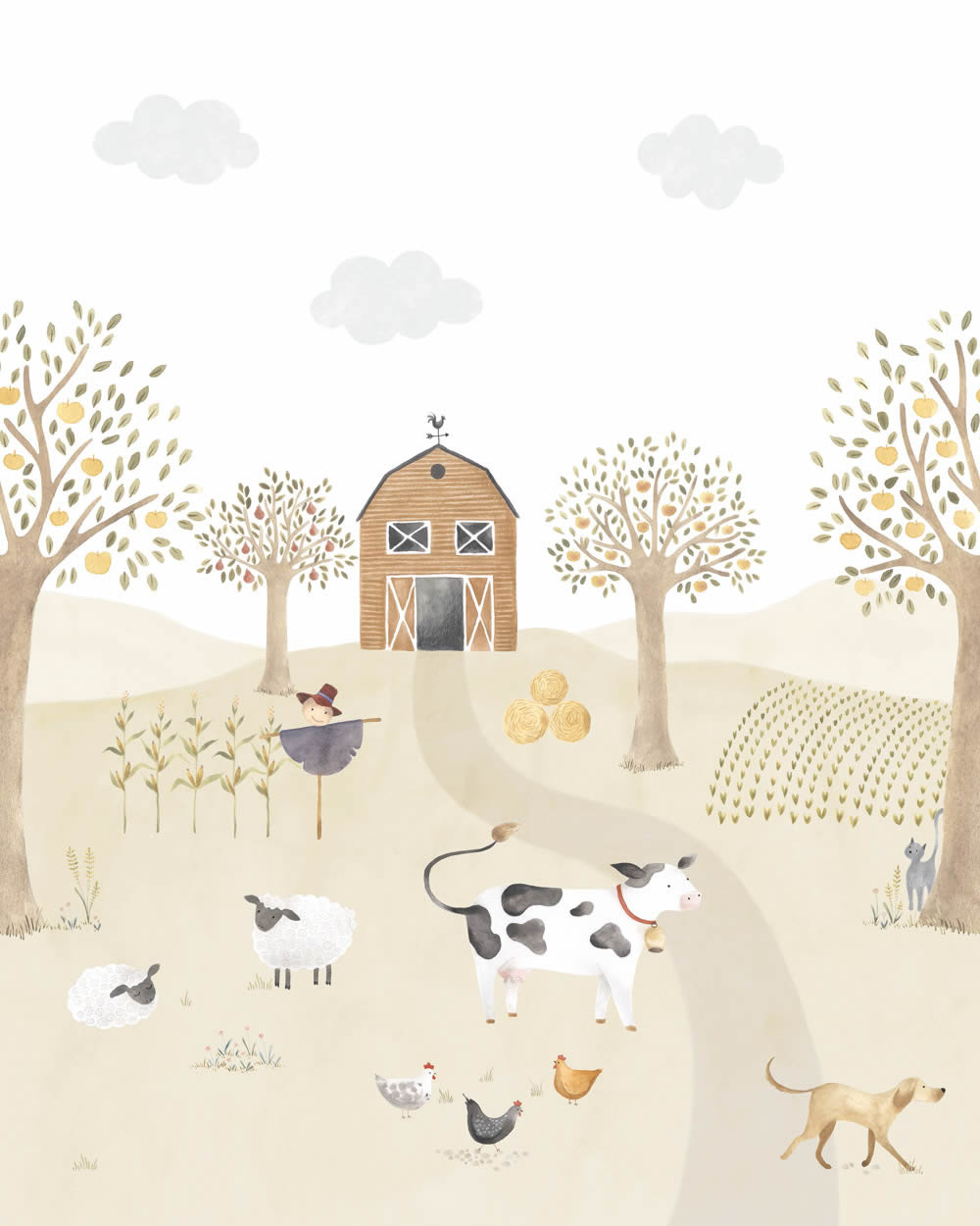 Produktinformationen "Wandbild 2,00 x 2,50 m Bauernhof Kuh Hund Tiere Vogelscheuche pastellfarben"