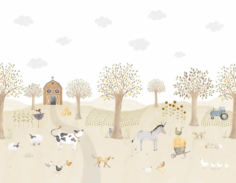 Produktinformationen "Wandbild 4,00 x 3,10 m pastellfarben Bauernhof Kuh Esel Hühner Traktor Wiese Obstbäume"