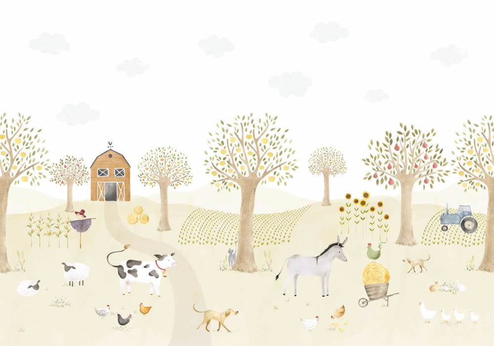 Produktinformationen "Wandbild 4,00 x 2,80 m Bauernhof Traktor Kuh Esel Hühner Obstbäume pastellfarben"