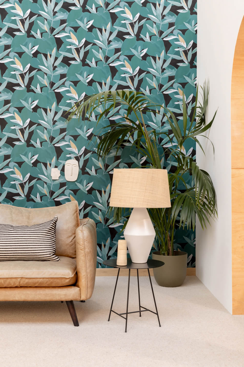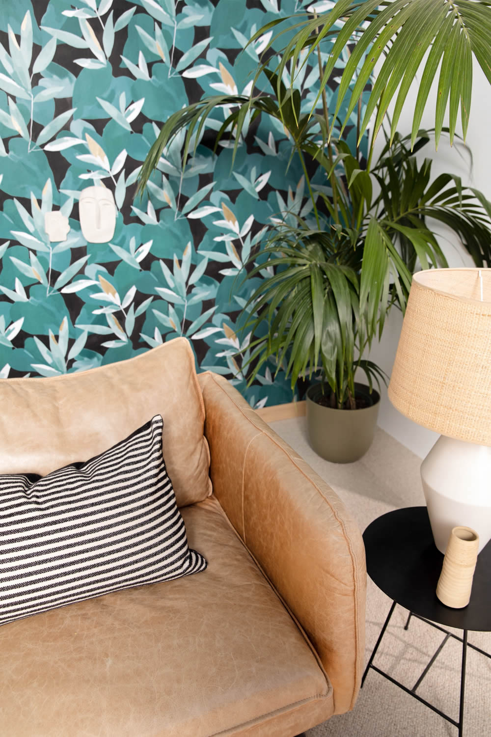 Große dunkel-grüne Monstera-Blätter verzieren die Wände im Teeniezimmer.