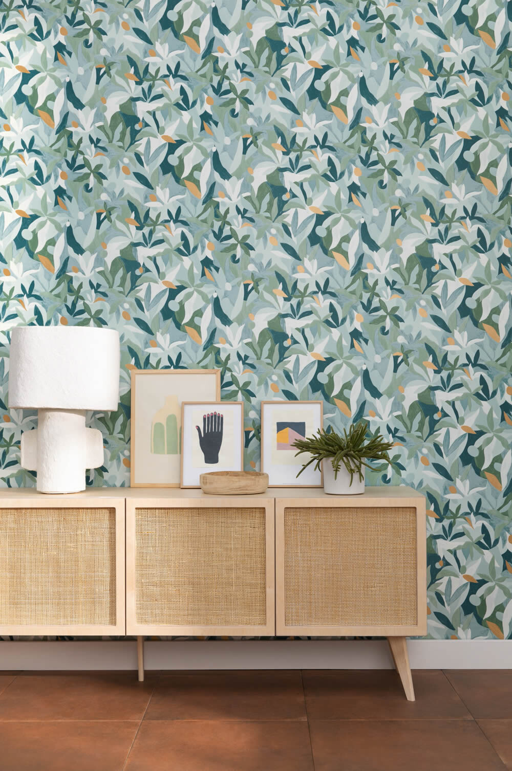 In verschiedenen Grüntönen schafft die Blättertapete eine natürliche Optik im Jugendzimmer.