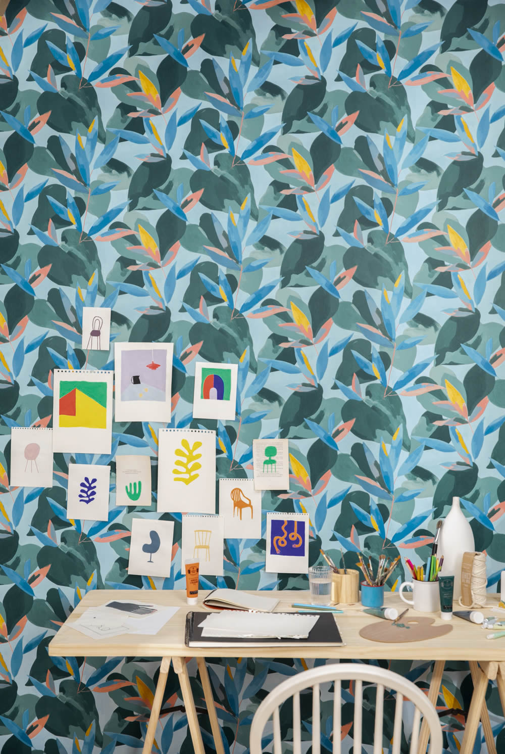 blau, grün, orange, gelb, Vliestapete, Monstera, Pflanzen, Blätter, matt, glatt, Jugendzimmer