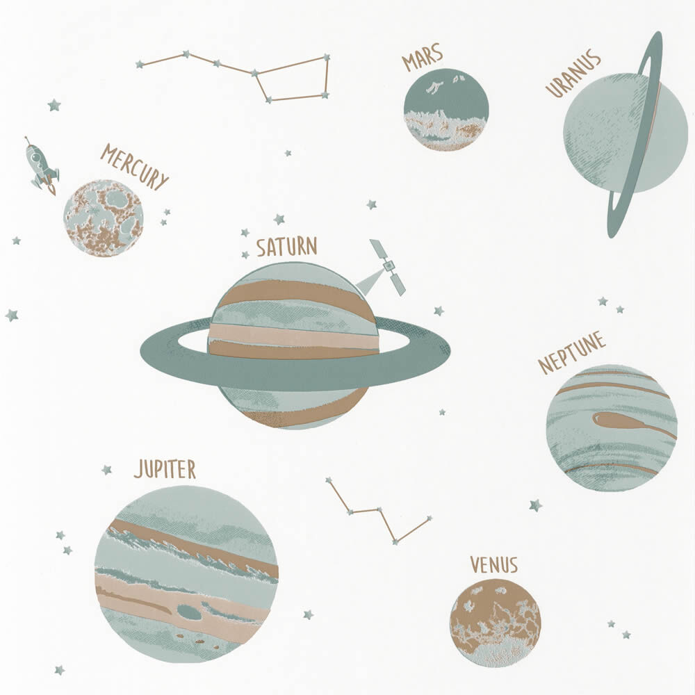 Musterstück Tapete Vlies Weiß Grün Braune Planeten Our Planet