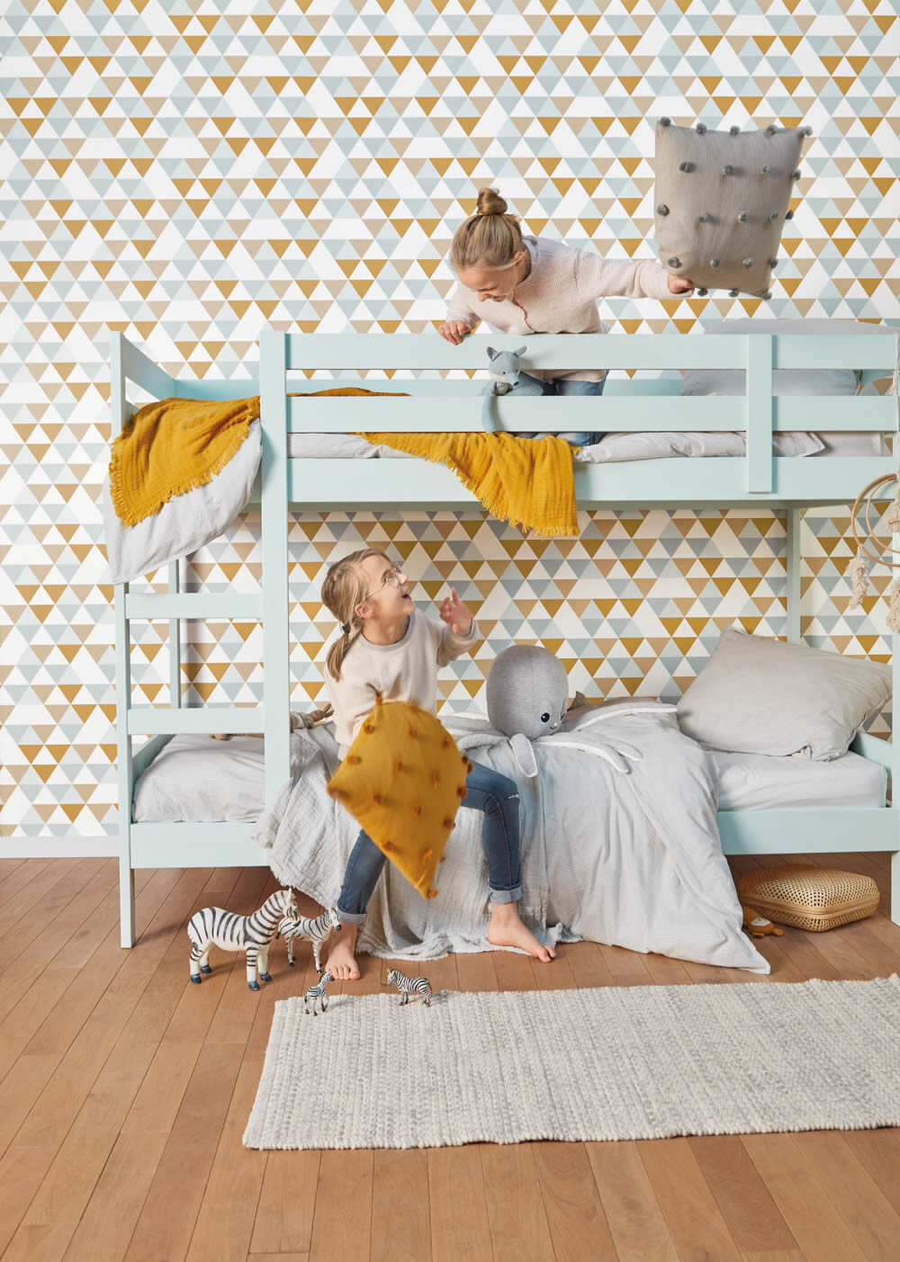Große Planeten und Sternbilder verteilen sich auf der weißen Vliestapete durch das Kinderzimmer.