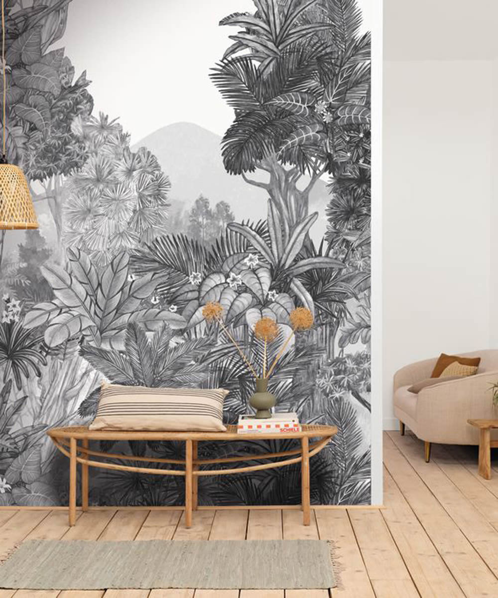 Die Fototapete mit tropischem Wald und Bergen in Grau und Weiß bringt eine künstlerische und gleichzeitig natürliche Atmosphäre in den Raum. Die filigrane Zeichnung zeigt eine üppige Landschaft mit dichten Mangroven, exotischen Pflanzen und hohen Palmen, die sich in der Ferne zu sanften Hügeln und Bergen auftürmen. Die feine Schattierung und der monochrome Stil verleihen dem Motiv eine elegante Tiefe, die sowohl beruhigend als auch stilvoll wirkt. Die dezente Farbgebung passt perfekt zu modernen, minimalistischen oder klassischen Wohnstilen und fügt sich harmonisch in verschiedene Raumkonzepte ein. Diese Tapete ist ideal für Wohnzimmer, Schlafzimmer oder elegante Arbeitsbereiche und verleiht jedem Raum eine stilvolle, beruhigende Wirkung. Die glatte, matte Oberfläche verstärkt den hochwertigen Look und sorgt für eine angenehme Haptik. Dank der wasserbeständigen und lichtbeständigen Eigenschaften bleibt das Design über lange Zeit hinweg frisch und farbintensiv. Die Wandklebetechnik ermöglicht eine einfache Anbringung ohne Einweichzeit, und falls eine Veränderung gewünscht ist, kann die Tapete trocken restlos entfernt werden. Diese tropische Wandtapete ist ideal für alle, die eine raffinierte und stilvolle Raumgestaltung mit natürlicher Eleganz suchen.