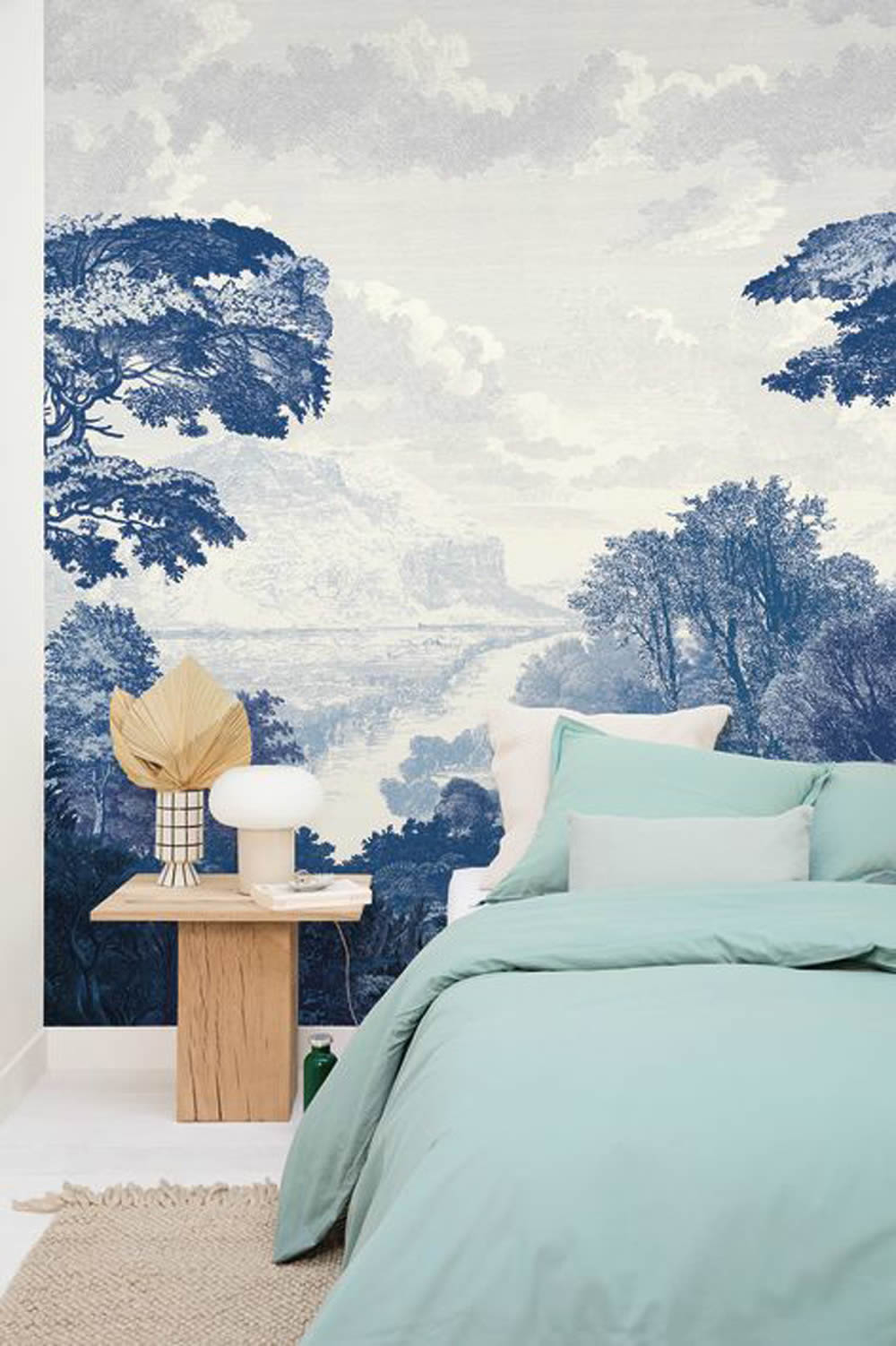 Die Fototapete mit ihrer detailreichen Darstellung eines Wald- und Flussgebiets in sanften Blautönen verwandelt jeden Raum in eine ruhige und elegante Naturlandschaft. Die kunstvolle Szenerie zeigt hohe, majestätische Bäume, einen geschwungenen Flusslauf und sanfte Hügel, die sich am Horizont verlieren. Durch die raffinierte Schattierung und die monochrome Farbgestaltung entsteht eine beeindruckende Tiefe, die das Motiv besonders edel wirken lässt. Die Kombination aus detailreichen Bäumen im Vordergrund und nebelverhangenen Hügeln in der Ferne erzeugt eine harmonische Balance zwischen lebendiger Natur und beruhigender Stille. Die Farbpalette aus verschiedenen Blaunuancen sorgt für eine entspannte Atmosphäre, die besonders gut in Wohnräumen, Schlafzimmern oder stilvollen Arbeitsbereichen zur Geltung kommt. Die glatte matte Oberfläche verstärkt den hochwertigen Look und sorgt für eine angenehme Haptik. Dank der wasserbeständigen und lichtbeständigen Eigenschaften bleibt das Design lange frisch und farbintensiv. Die Wandklebetechnik ermöglicht eine einfache Anbringung ohne Einweichzeit und falls eine Veränderung gewünscht ist, kann die Tapete trocken restlos entfernt werden. Diese eindrucksvolle Landschaftstapete ist ideal für alle, die eine elegante und stilvolle Wandgestaltung mit natürlichem Flair suchen.