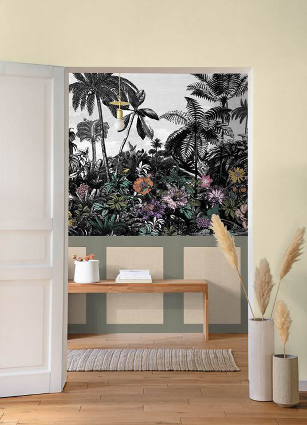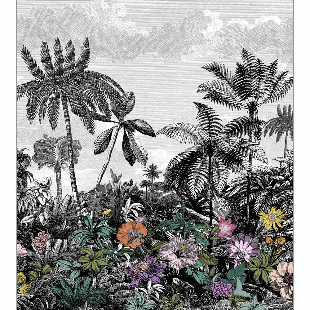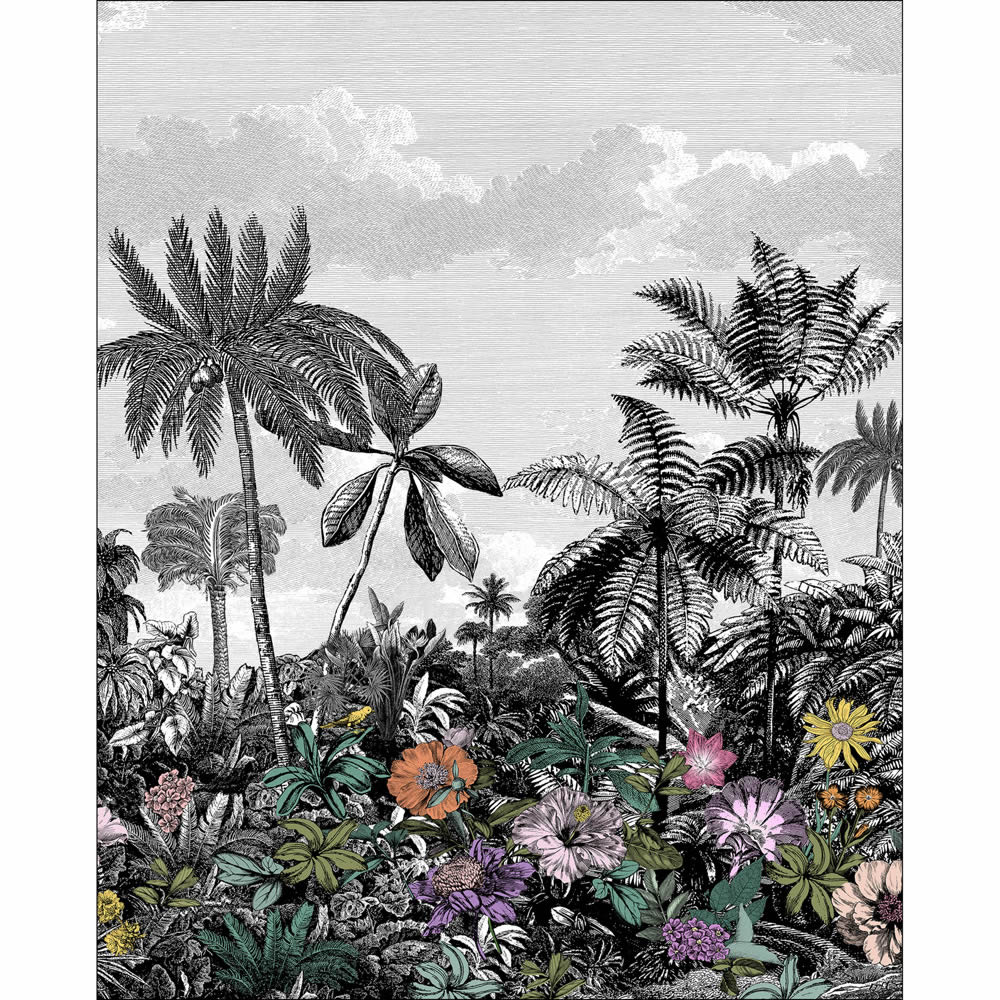 Dieses eindrucksvolle Wandbild fängt die faszinierende Atmosphäre eines tropischen Regenwaldes ein und verbindet kunstvolle Schwarz-Weiß-Illustrationen mit lebendigen Farben. Detailreich gezeichnete Palmen, Farne und dichte Vegetation bilden eine imposante Kulisse, die durch farbige Blüten in Orange, Lila, Rosa und Gelb aufgelockert wird. Diese Kombination aus klassischer Zeichnung und modernen Farbdetails sorgt für eine außergewöhnliche und stilvolle Optik, die sich ideal für moderne Wohnräume oder Jugendzimmer eignet. Die feinen Linien und Schattierungen verleihen der Szene Tiefe und lassen die exotische Natur besonders lebendig wirken. Die matte, glatte Oberfläche unterstreicht die Brillanz der Kontraste und gibt dem Wandbild eine edle Note. Mit einer Größe von 2,00 x 2,50 m wird diese Fototapete zu einem beeindruckenden Blickfang. Dank der ansatzfreien Gestaltung ist die Anbringung besonders einfach, da keine Musteranschlüsse beachtet werden müssen. Die Wandklebetechnik ermöglicht eine mühelose Montage, während die Tapete trocken restlos entfernt werden kann, wenn eine Veränderung gewünscht ist. Zudem ist sie wasserbeständig und gut lichtbeständig, sodass die Kontraste und Farben lange erhalten bleiben. Dieses Wandbild ist die perfekte Wahl für alle, die tropische Natur mit einem Hauch von künstlerischer Eleganz verbinden möchten.