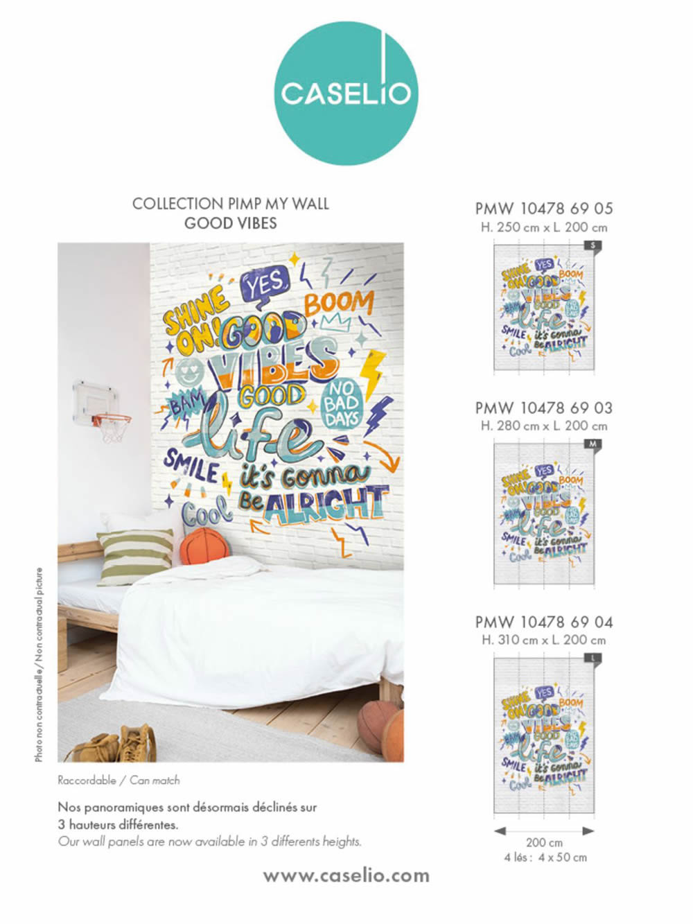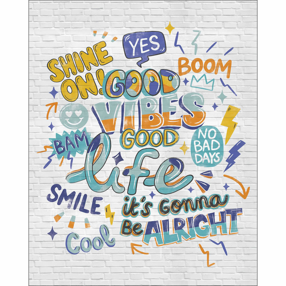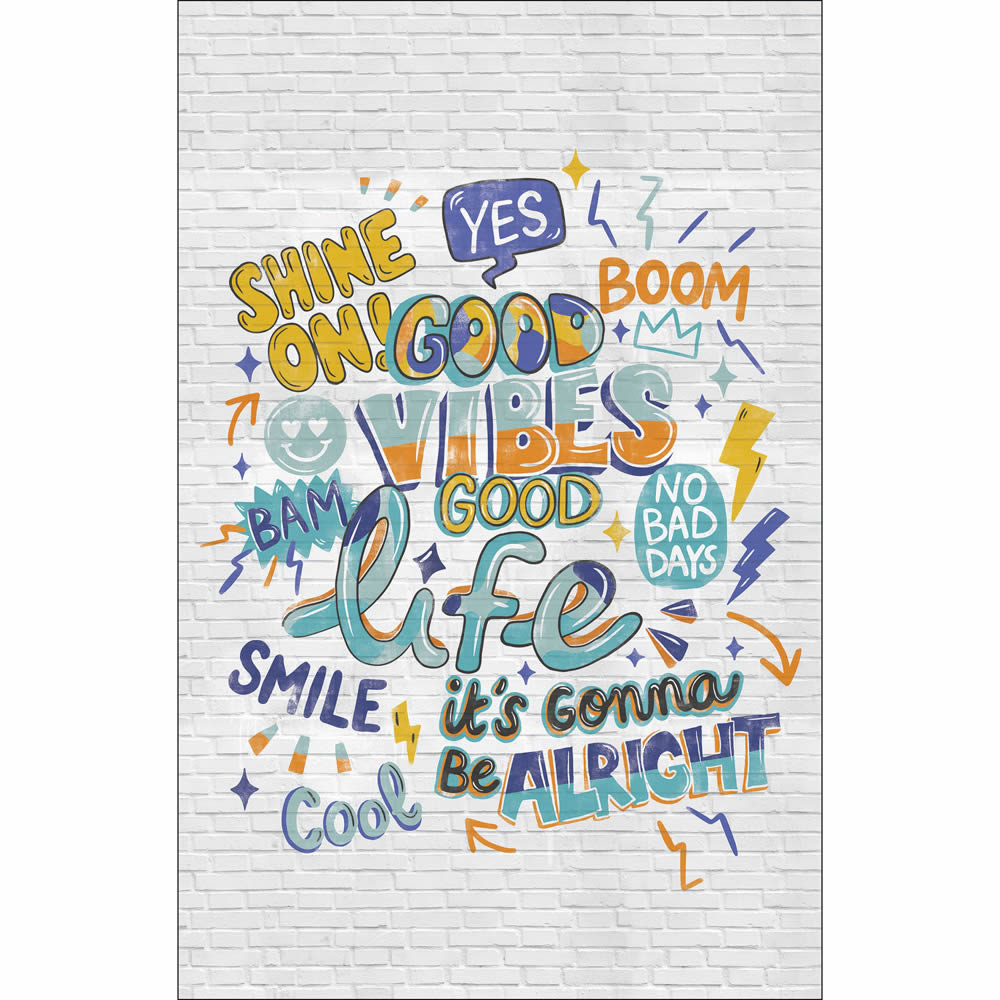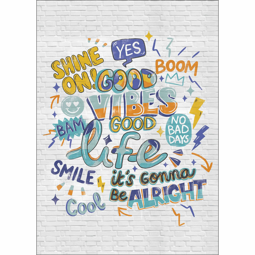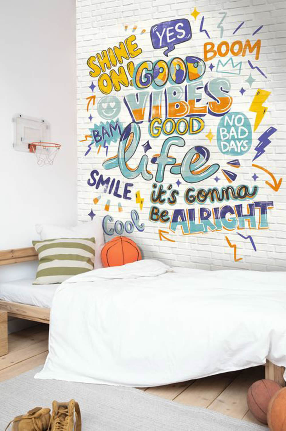 Dieses trendige Wandbild mit einem bunten Graffiti-Schriftzug bringt urbanen Street-Art-Charme direkt ins Zuhause. Die auffälligen Schriftzüge in Gelb, Blau und Mint sind dynamisch angeordnet und mit energiegeladenen Symbolen wie Blitzen, Sternen und Pfeilen kombiniert. Die kreativen Botschaften wie Good Vibes und No Bad Days versprühen positive Energie und verleihen dem Raum eine jugendliche, moderne Atmosphäre. Der Hintergrund in Backsteinoptik verstärkt den urbanen Look und sorgt für einen authentischen Graffiti-Style. Die glatte, matte Oberfläche hebt die kräftigen Farben hervor und verleiht der Tapete eine hochwertige Ausstrahlung. Mit einer Größe von 2,00 x 2,50 m wird sie zum Eyecatcher in Jugendzimmern, Kinderzimmern oder kreativen Wohnbereichen. Dank der ansatzfreien Gestaltung ist die Anbringung besonders einfach, da keine Musteranschlüsse beachtet werden müssen. Die Wandklebetechnik ermöglicht eine mühelose Montage, während die Tapete trocken restlos entfernt werden kann, wenn eine Veränderung gewünscht ist. Zudem ist sie wasserbeständig und gut lichtbeständig, sodass die Farben lange erhalten bleiben. Dieses Wandbild ist ideal für alle, die einen modernen, coolen Look mit positiver Ausstrahlung in ihrem Raum schaffen möchten.