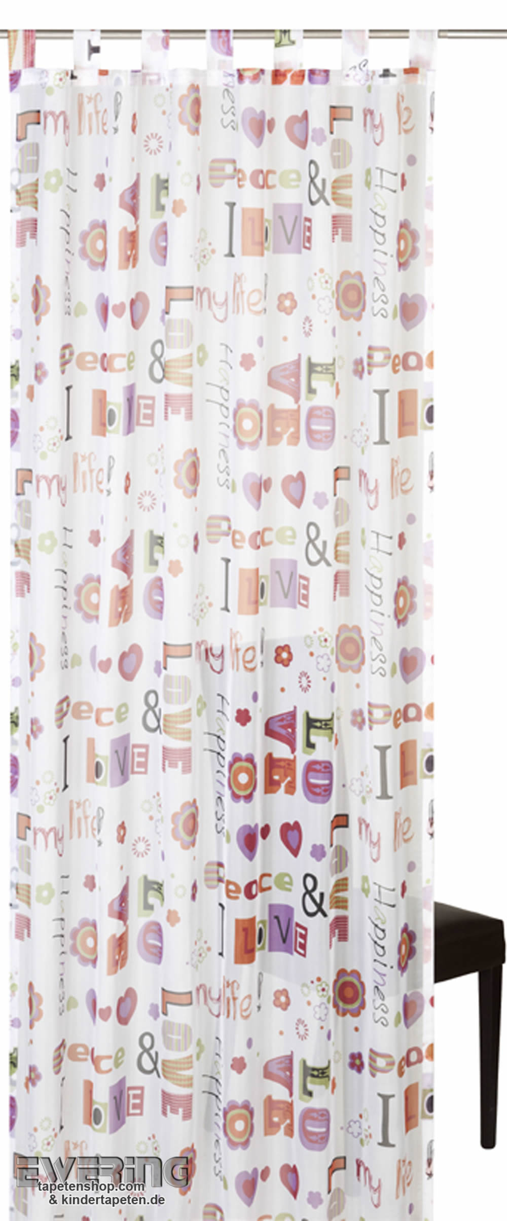 bunt, Gardine, Fertig-Deko, Love, Happiness, Blumen, Schrift, rot, pink, grün, weiß