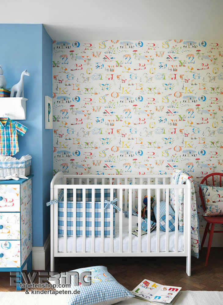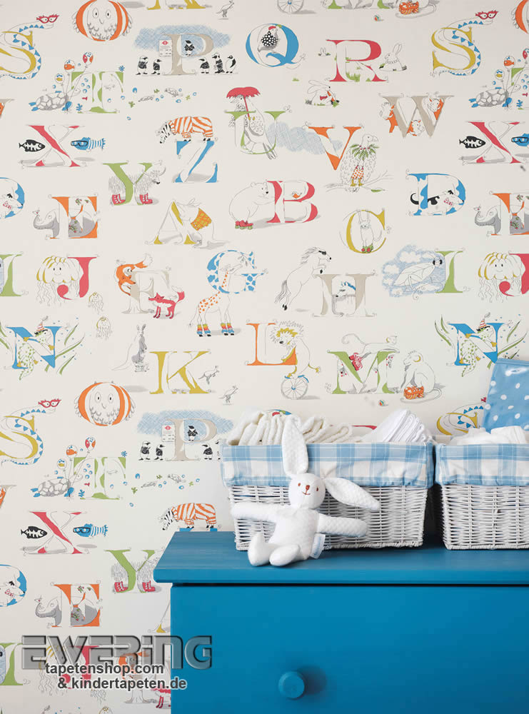 Bunt, creme-weiß, Buchstaben-Zoo, Tiere, matt, glatt, Kinder, Papiertapete, Mustertapete