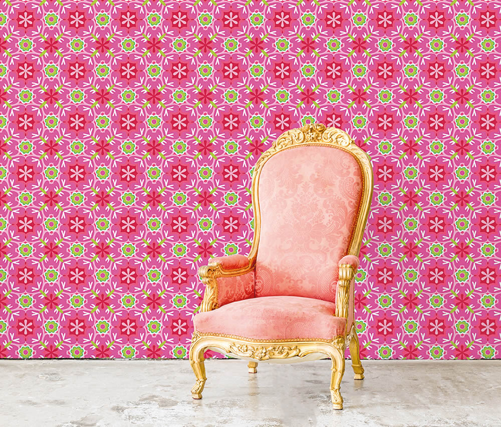 Wandbild, Kinderzimmer, Vliesträger, 2 Bahnen, 100 x 280 cm, matt, glatt, pink, rot, weiß, grün, Muster wiederholbar, Blumen, Kaleidoskop-Optik