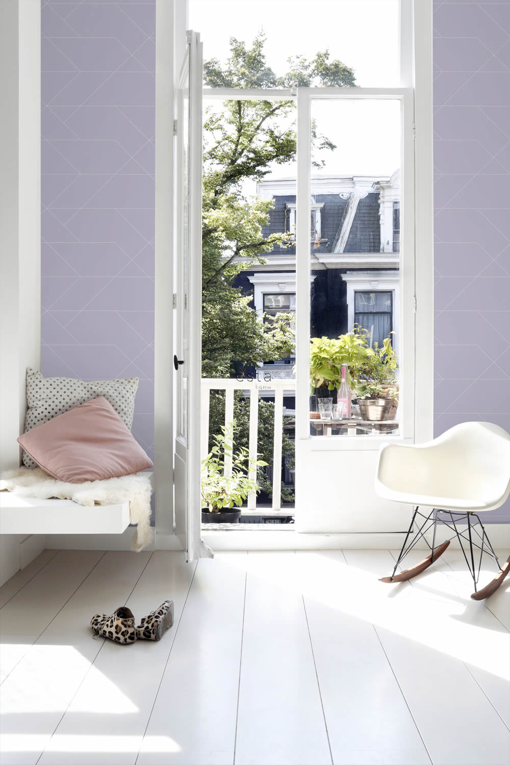 This wallpaper with a graphic pattern in lilac and violet is perfect for modern kids and teen rooms. The abstract design adds structure and creativity to the space, while the smooth matte surface offers a clean, stylish finish. Easy to apply with paste-the-wall method, washable, lightfast and dry strippable. Offset match with 17.6 cm repeat.