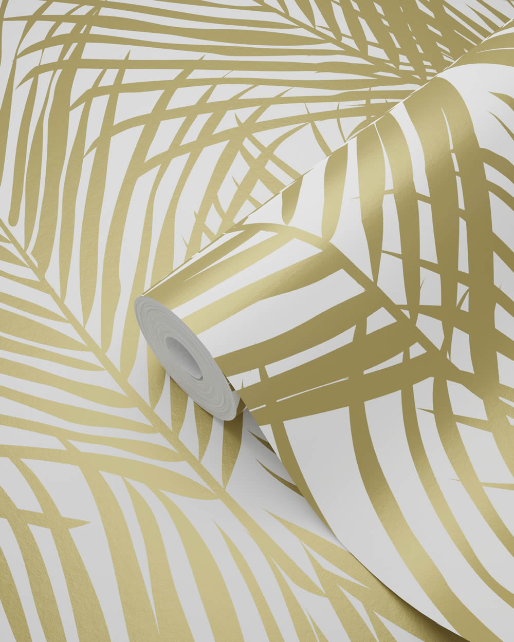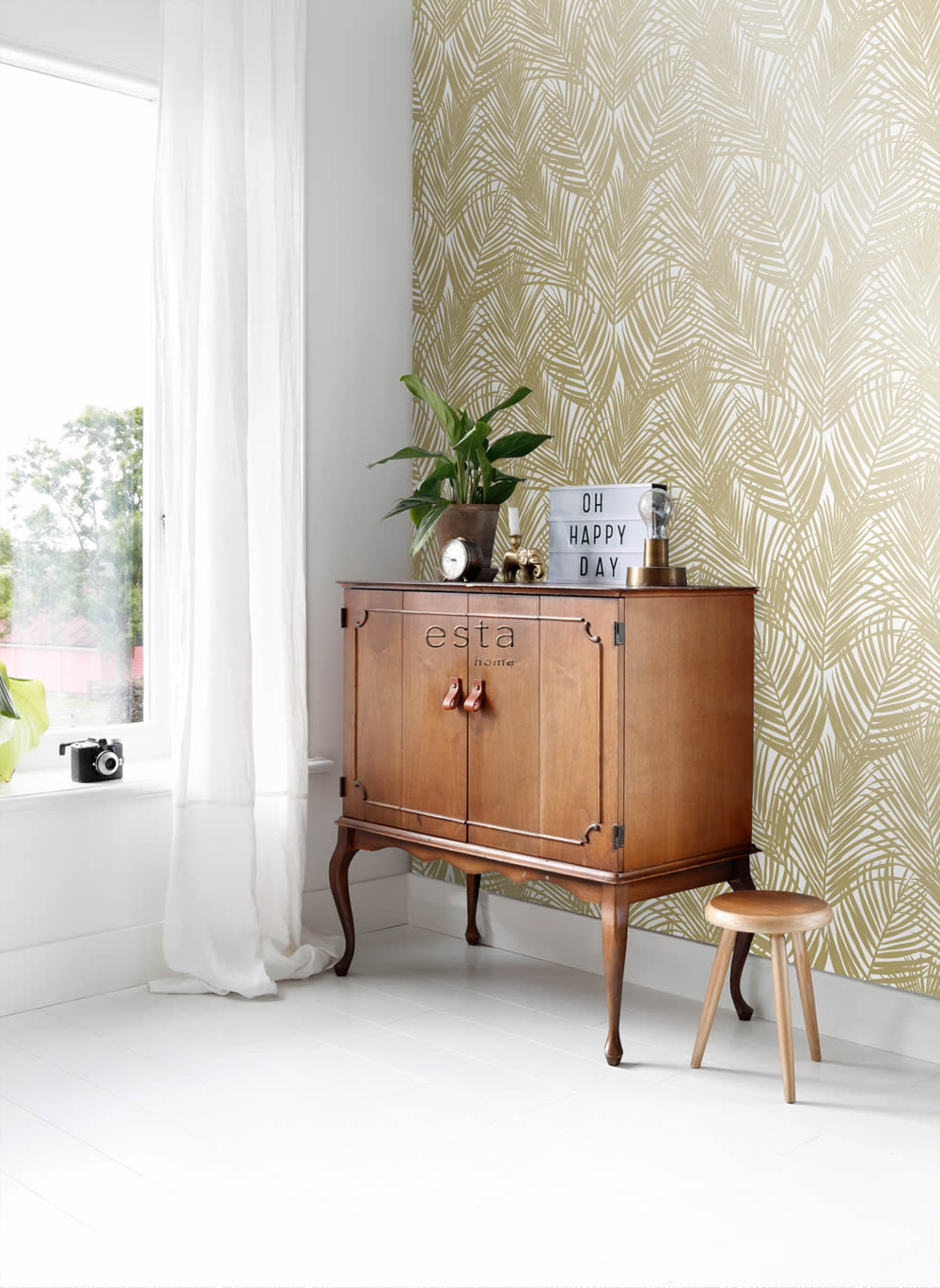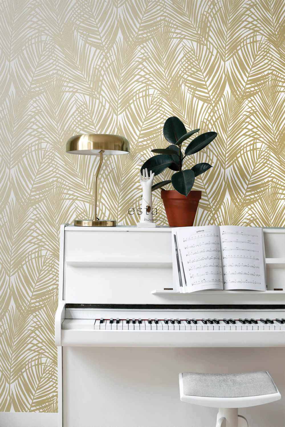Non-woven wallpaper with golden leaves and fern pattern white 139301