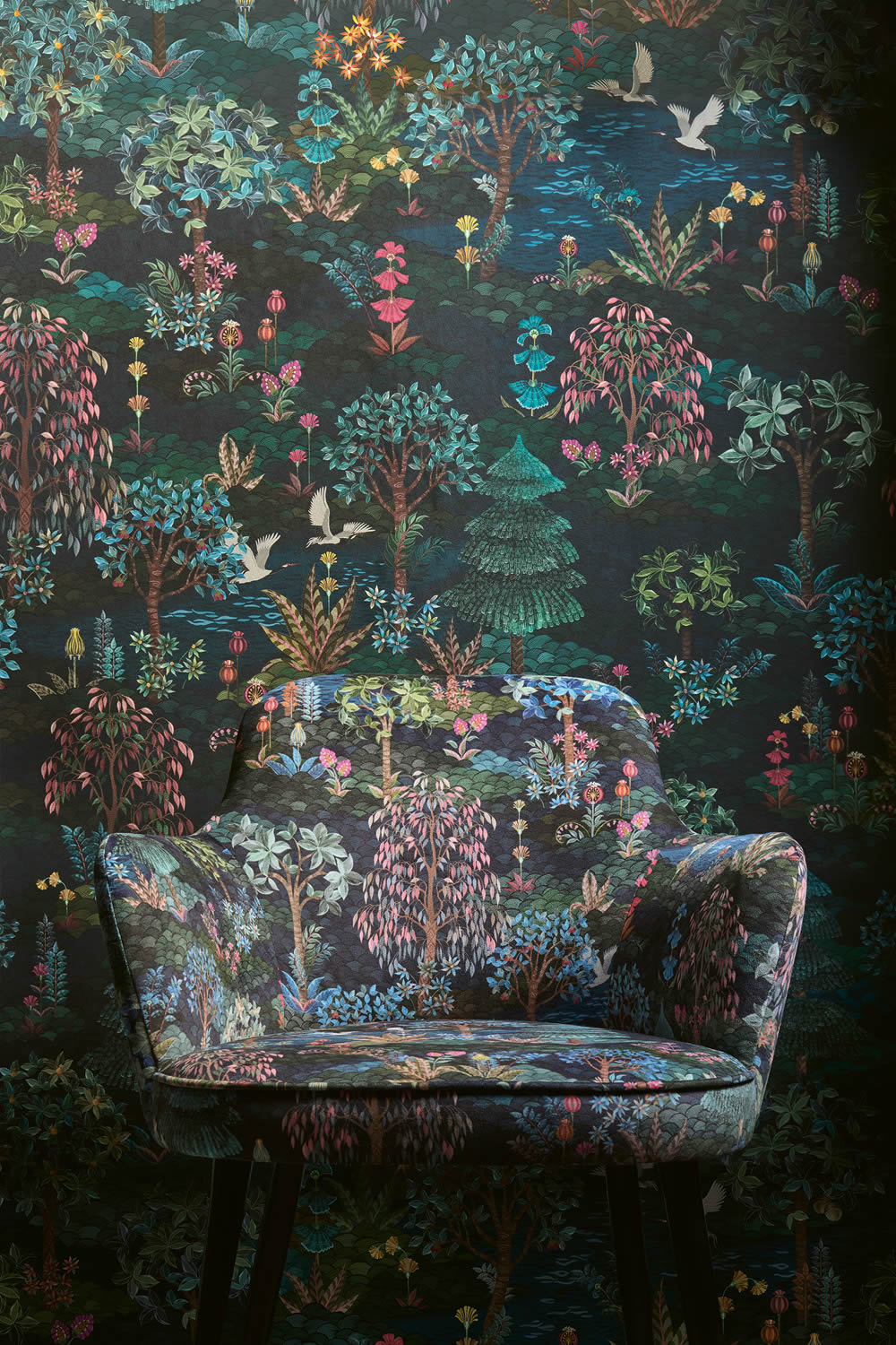 Wandbild mit exotischem Gartenmotiv: Üppige Bäume, kunstvoll gestaltete Pflanzen und verspielte Tiere erschaffen eine faszinierende Szenerie in satten Blau- und Naturtönen. Die glatte, matte Oberfläche bringt die feinen Details eindrucksvoll zur Geltung. Dieses hochwertige Vliestapeten-Wandbild von Eijffinger entführt in eine traumhafte Welt und überzeugt nicht nur optisch, sondern auch durch seine praktischen Eigenschaften - es ist waschbeständig, gut lichtbeständig und kann trocken restlos entfernt werden. Dank der Wandklebetechnik lässt es sich besonders einfach anbringen. Perfekt für Kinderzimmer, Teenager-Zimmer oder Wohnräume mit exotischer Eleganz.