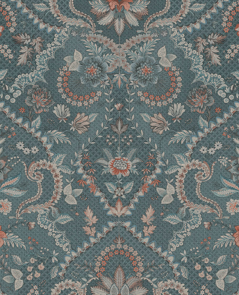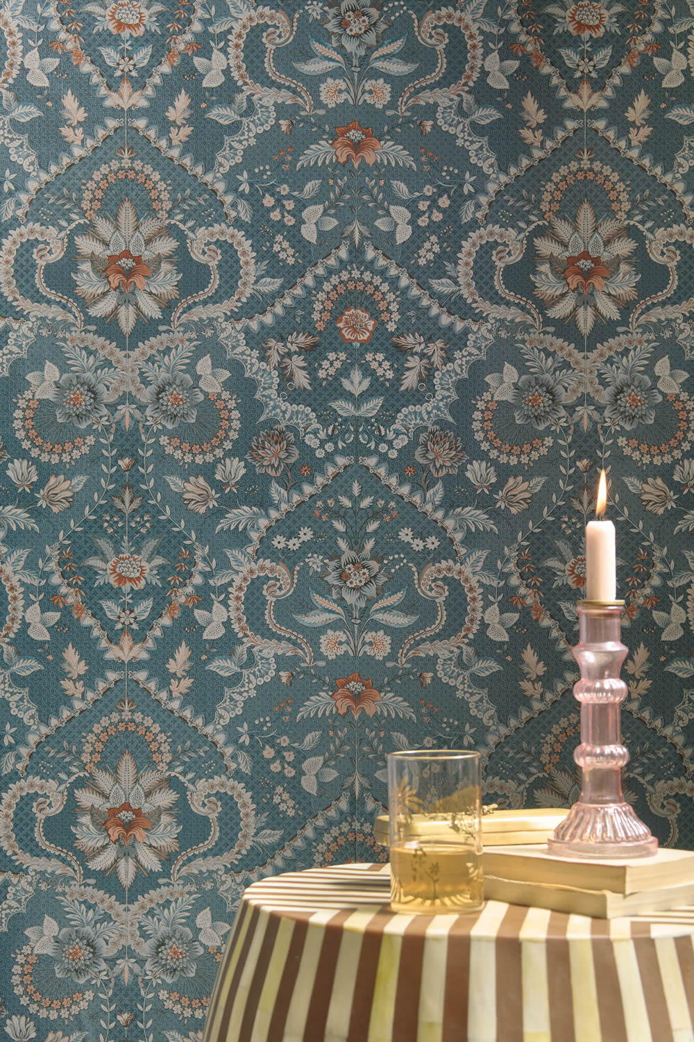 Vliestapete im Vintage-Stil mit floralen Ornamenten und Ranken in zarten, mehrfarbigen Tönen auf einem blauen Hintergrund. Das verspielte Design schafft eine elegante und natürliche Atmosphäre, ideal für Kinder- und Teenagerzimmer. Mit ihrer fein strukturierten, matten Oberfläche betont sie die filigranen Details. Die Tapete ist waschbeständig, lichtbeständig und schwer entflammbar. Sie lässt sich mit der Wandklebetechnik einfach anbringen und trocken ohne Rückstände entfernen.