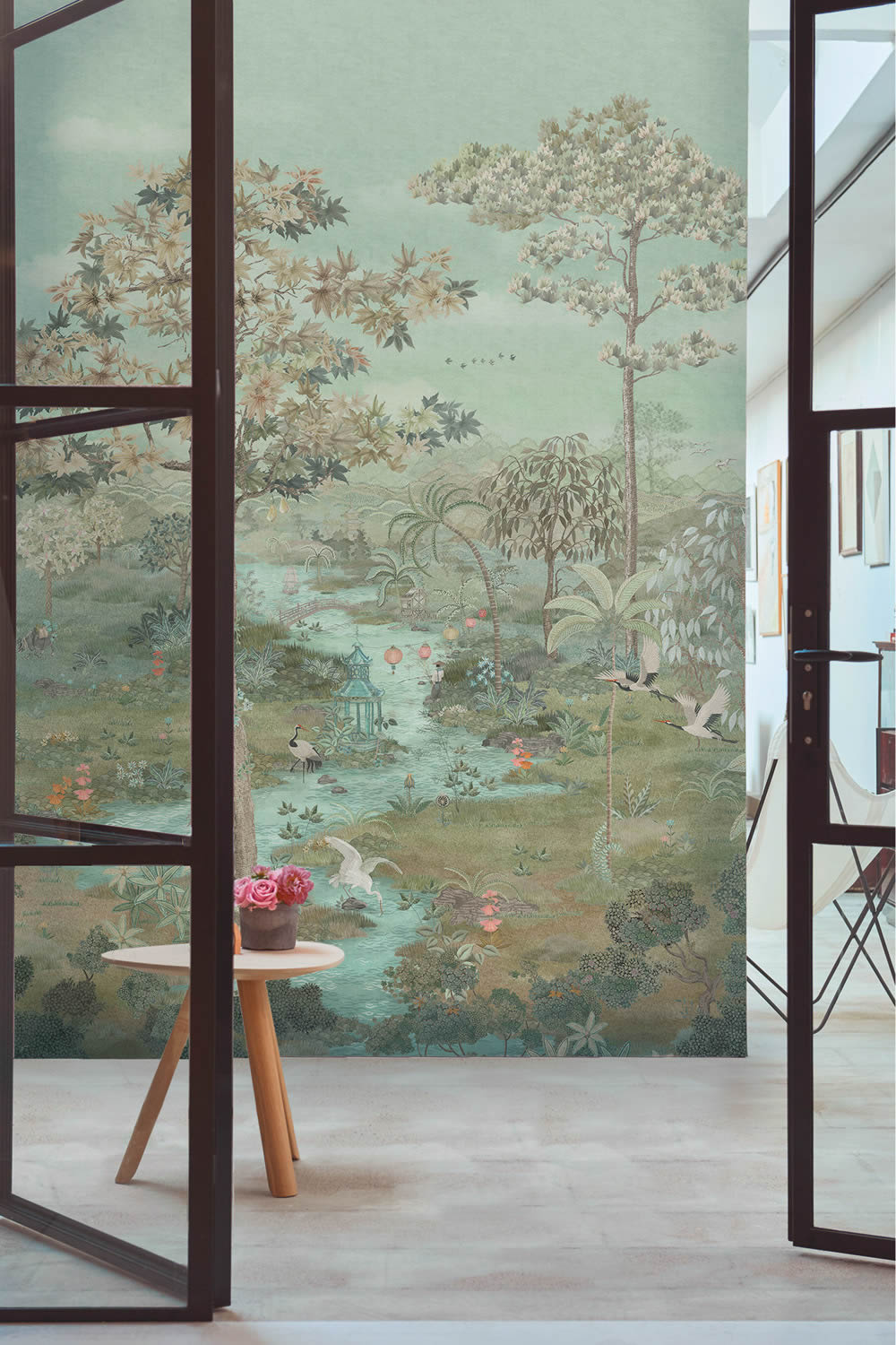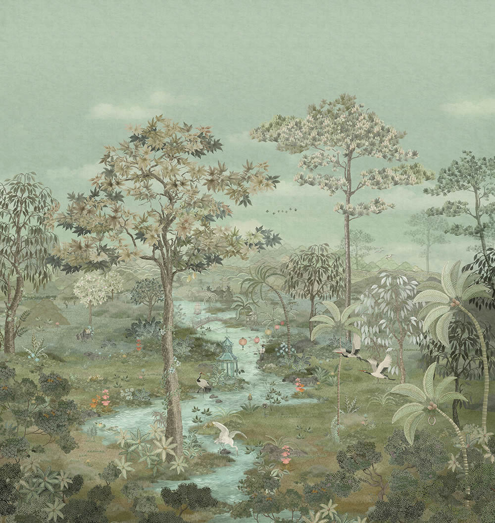 Wandbild mit malerischer Landschaft: Eine idyllische Naturszene mit sanften Flussläufen, exotischen Pflanzen und üppigen Bäumen entfaltet sich in harmonischen Grüntönen. Das detailreiche Design erinnert an traditionelle asiatische Kunst und verleiht Räumen eine ruhige, elegante Atmosphäre. Die glatte, matte Oberfläche bringt die filigranen Elemente besonders schön zur Geltung. Dieses hochwertige Vliestapeten-Wandbild aus der Pip-Kollektion überzeugt nicht nur optisch, sondern auch durch seine praktischen Eigenschaften - es ist waschbeständig, gut lichtbeständig und kann trocken restlos entfernt werden. Dank der Wandklebetechnik lässt es sich besonders leicht anbringen. Perfekt für Kinderzimmer, Teenager-Zimmer oder Wohnräume mit einer natürlichen, stilvollen Gestaltung.