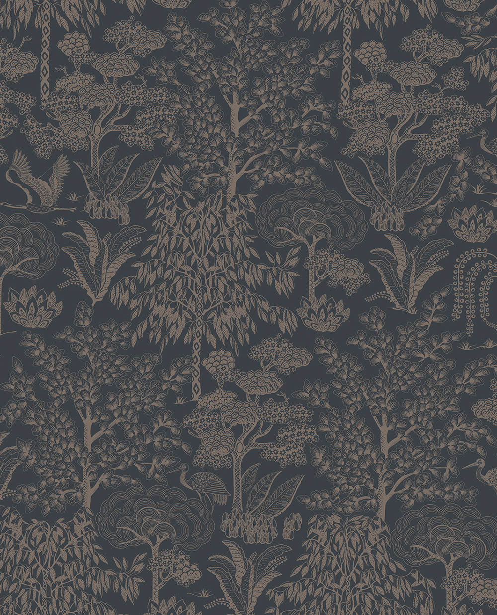 Vliestapete im Märchenwald-Stil mit einem zauberhaften Design aus stilisierten Bäumen und Pflanzen in Bronze auf einem tiefblauen Hintergrund. Die glänzende und matte Oberfläche kombiniert auf elegante Weise, wodurch das Muster besonders betont wird. Ideal für Kinderzimmer, Mädchenzimmer und Teenager-Räume. Die Tapete ist waschbeständig, lichtbeständig und schwer entflammbar. Mit der Wandklebetechnik lässt sie sich einfach anbringen und trocken ohne Rückstände entfernen.