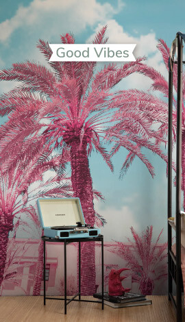 Ein natürliches Flair im Raum versprechen die tolle Wandbilder mit großen Palmenmotiven und Blättermustern in frischen Farben. Für besondere farbliche Akzente bietet Good Vibes das Tapetenmuster in zwei bunten Farbvariationen. Wer die Wände lieber etwas schlichter gestalten möchte, findet in dieser Kollektion das gleiche Muster in schlichten Grautönen. Eine besonders coole Wirkung hat die Vliestapete mit grünen Blättern und bunten Schriftzügen in Neonfarben. Diese Tapeten eignen sich perfekt für die Wandgestaltung in einem Club oder einem modernen Büro.