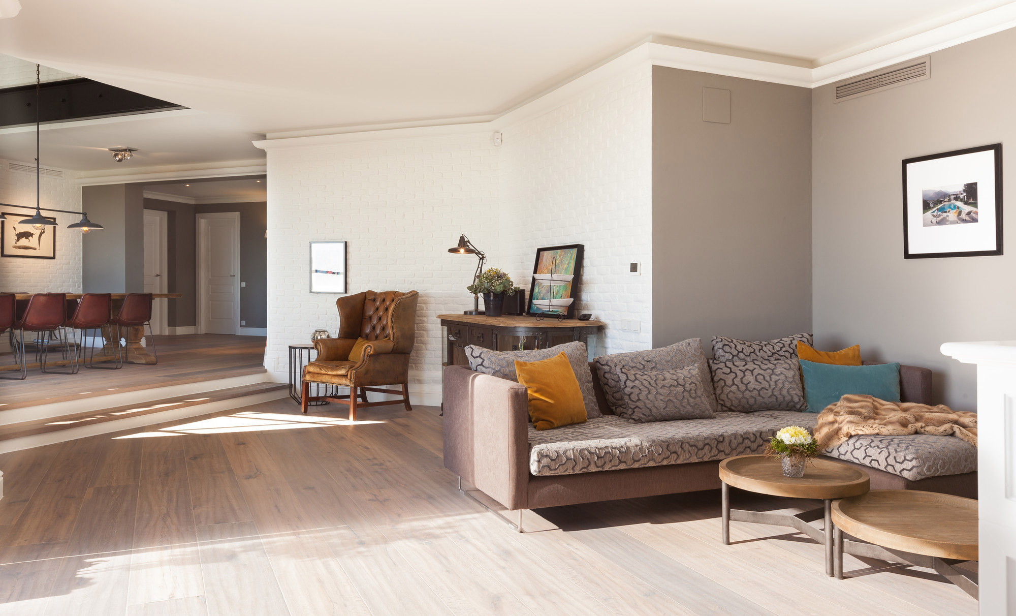 Modernes Wohn-/Esszimmer mit Stuck-Deckenleisten