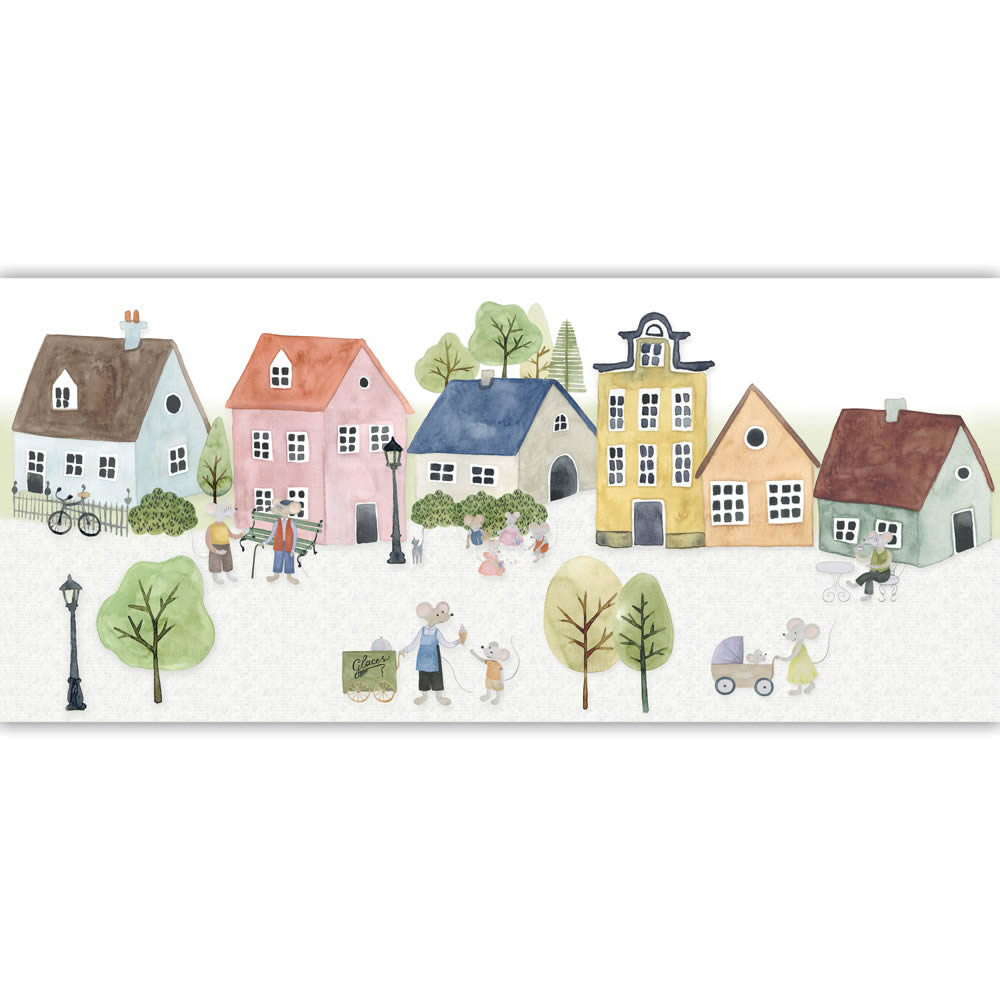Bordüre kleine Mäuse Stadt - verspielte Stadtszene mit bunten Häusern und niedlichen Mäusen. Diese hochwertige Bordüre zeigt eine malerische Stadt mit detailreichen Häusern, kleinen Bäumen und Mäusen, die durch die Straßen spazieren. Die sanften Pastelltöne verleihen dem Motiv eine warme und freundliche Ausstrahlung. Die glatte, matte Oberfläche sorgt für eine hochwertige Optik. Ansatzfrei für eine einfache Anbringung, waschbeständig und lichtbeständig für langanhaltende Farbbrillanz. Perfekt für Baby- und Kinderzimmer.