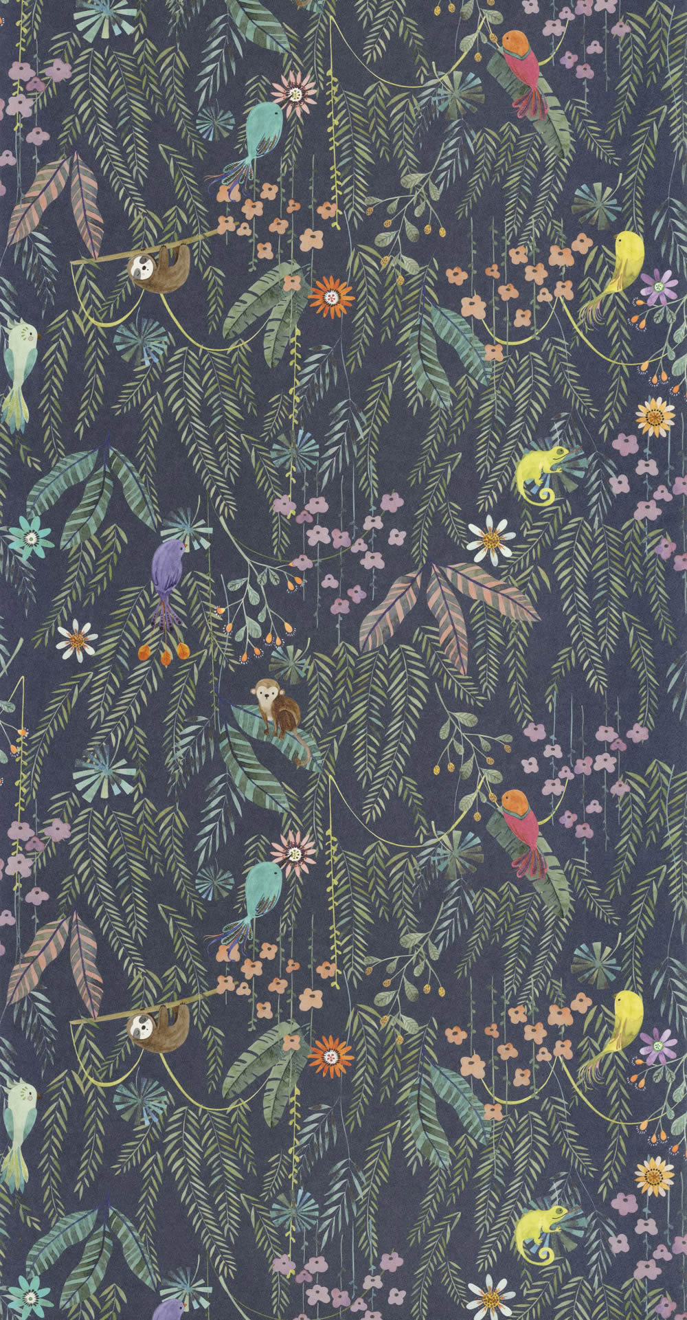 Regenwald Vliestapete dunkel blaugrau - exotisches Dschungel-Design mit Affen und Vögeln. Diese hochwertige Vliestapete im Digitaldruck zeigt ein detailreiches Muster aus tropischen Pflanzen, Affen und farbenfrohen Vögeln auf einem dunkel blaugrauen Hintergrund. Die glatte, matte Oberfläche verleiht dem Raum eine stilvolle Optik. Dank Wandklebetechnik ist die Tapete leicht anzubringen und kann trocken restlos abgezogen werden. Sie ist waschbeständig und gut lichtbeständig. Perfekt für Baby-, Kinder- und Jugendzimmer.