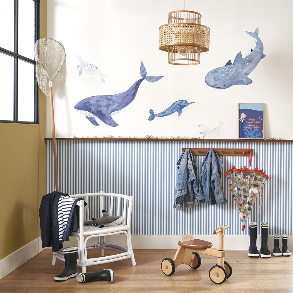 Vliestapete mit liebevollen Meeresmotiven wie Schildkröten und Korallen in sanften Blautönen auf weißem Hintergrund. Das maritime Design schafft eine ruhige und freundliche Atmosphäre im Kinderzimmer. Die glatte, matte Oberfläche sorgt für eine moderne Optik. Dank der Wandklebetechnik ist die Anbringung besonders einfach. Zudem ist die Tapete gut lichtbeständig, waschbeständig und kann trocken restlos entfernt werden. Mit einem versetzten Ansatz von 21 cm entsteht ein harmonisches Musterbild.