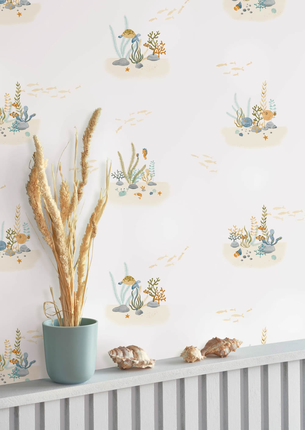 Vliestapete mit niedlichen Meeresmotiven wie Seepferdchen, Muscheln und Krebsen in sanften Beige- und Blautönen. Das maritime Design schafft eine ruhige und natürliche Atmosphäre im Kinderzimmer. Die glatte, matte Oberfläche sorgt für eine moderne Optik. Dank der Wandklebetechnik ist die Anbringung besonders einfach. Zudem ist die Tapete gut lichtbeständig, waschbeständig und kann trocken restlos entfernt werden. Mit einem versetzten Ansatz von 21 cm entsteht ein harmonisches Musterbild.