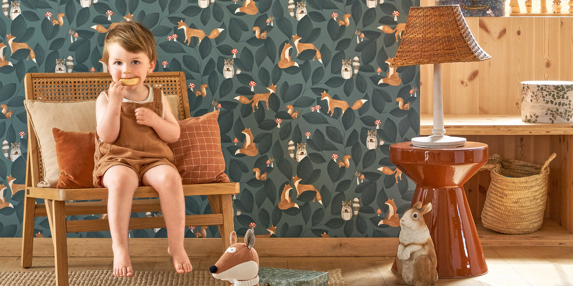 Im Themenbereich „Once Upon A Time In“ dreht sich alles um Waldmotive. Mit Tapeten in sanften Farben und natürlichen Designs bringen Sie die beruhigende Schönheit des Waldes ins Kinderzimmer. Niedliche Waldtiere wie Füchse, Waschbären, Eichhörnchen und Eulen verstecken sich zwischen Bäumen und Blättern, was eine spielerische und zugleich harmonische Atmosphäre schafft.