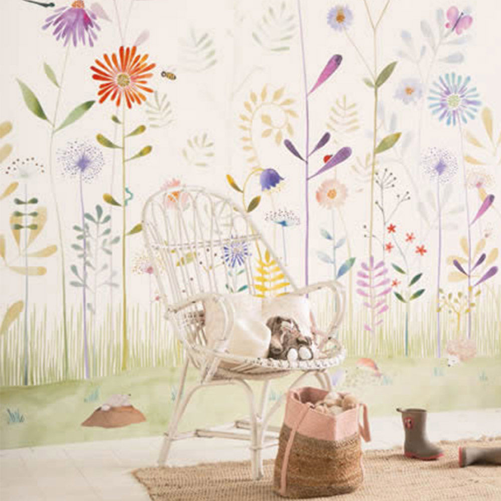Produktinformationen "Wandbild 2,00 x 2,50 m Wildblumenwiese Igel Maulwurf Schmetterlinge pastellfarben"
